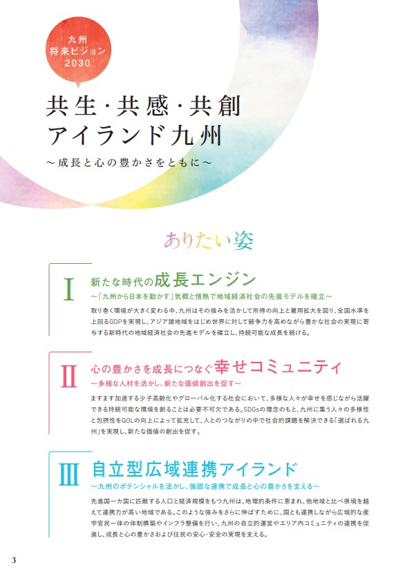 - 九州経済連合会が策定した「九州将来ビジョン2030」において、ありたい姿として『自立型広域連携アイランド(自立型広域経済の構築)』を打ち出し、産業や様々な課題を解決する取り組みを支えるためには九州が一体となって力を発揮することが重要だ、ということを再確認した。