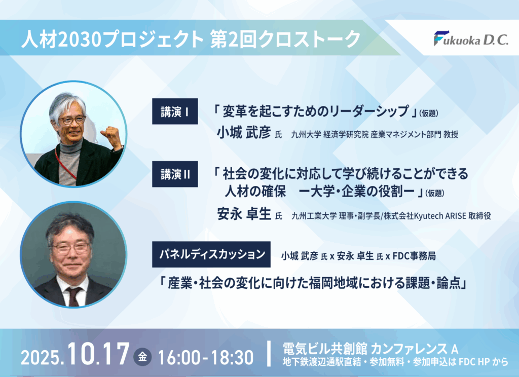 福岡地域戦略推進協議会(Fukuoka D.C.)は、福岡の新しい将来像を描き、地域の国際競争力を強化するために、地域の成長戦略の策定から推進までを一貫して行う、産学官民一体のThink&Do タンクです。福岡都市圏を核として、九州、さらには隣接するアジア地域との連携を図り、事業性のあるプロジェクトを推進しています。