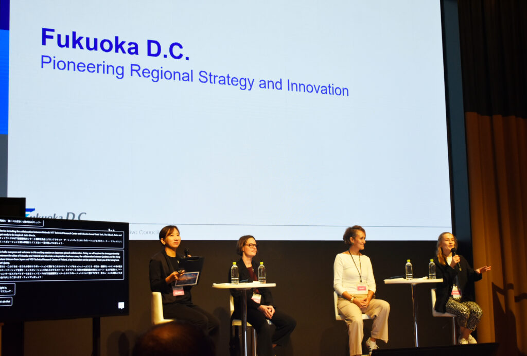 VTTフィンランド技術研究センター (以下、VTT)Business Development Manager Sanna Öörni氏、株式会社 KOALA Tech CEO, CTO Fatima Bencheikh氏とともに、イノベーション拠点であるヘルシンキと福岡の成功事例や、VTT と福岡市のスタートアップ「KOALA Tech」の協業など、具体的な取り組みを紹介しました。