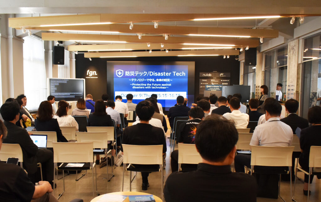 FDCは福岡市とともに、防災に関わる最新技術や製品を持つ国内外のスタートアップ5社が登壇するセッションを共催。司会はFDC寺本綾子事務局長補佐が務めました。