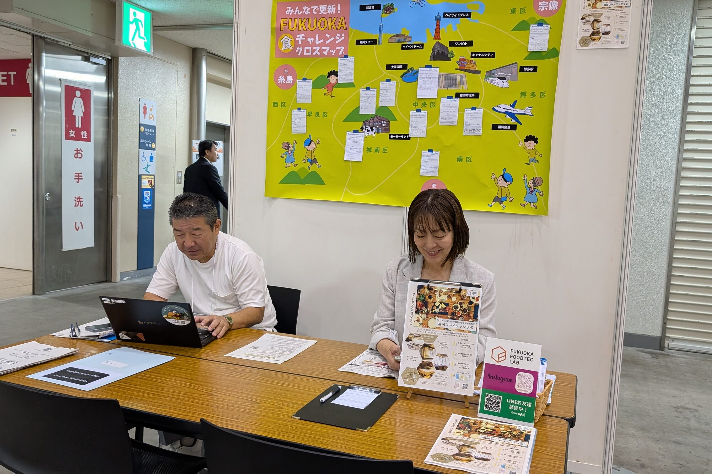 FDCは、今年度初めて産業創造部会にてブースを出展しました。ブースでは、福岡フードテックラボに掲示中の「食関連チャレンジマップ」のミニ版を掲出し、フードイノベーション分科会の取り組みを紹介。来場者や出展者の皆様には、食に関するチャレンジをエントリーカードに記入いただき、当該マップに掲出するなどして、交流を図りました。
