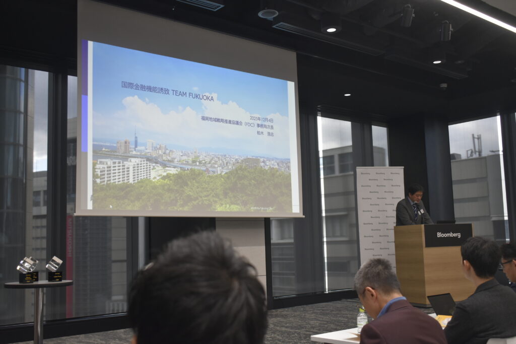 柏木事務局次長は講演で、FDCが推進する国際金融機能誘致「TEAM FUKUOKA」を紹介するとともに、海外ベンチマーク都市との比較を踏まえた福岡の現在地や将来像について説明しました。