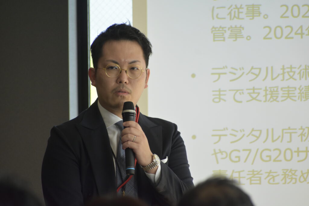 デジタル部会によるセッション「生成AI時代のデータ利活用の方向性」では、公益財団法人九州先端科学技術研究所 荒牧敬次専務理事・副所長、株式会社エル・ティー・エス 神瀬功崇執行役員、株式会社日立製作所 成田英将部長が登壇。